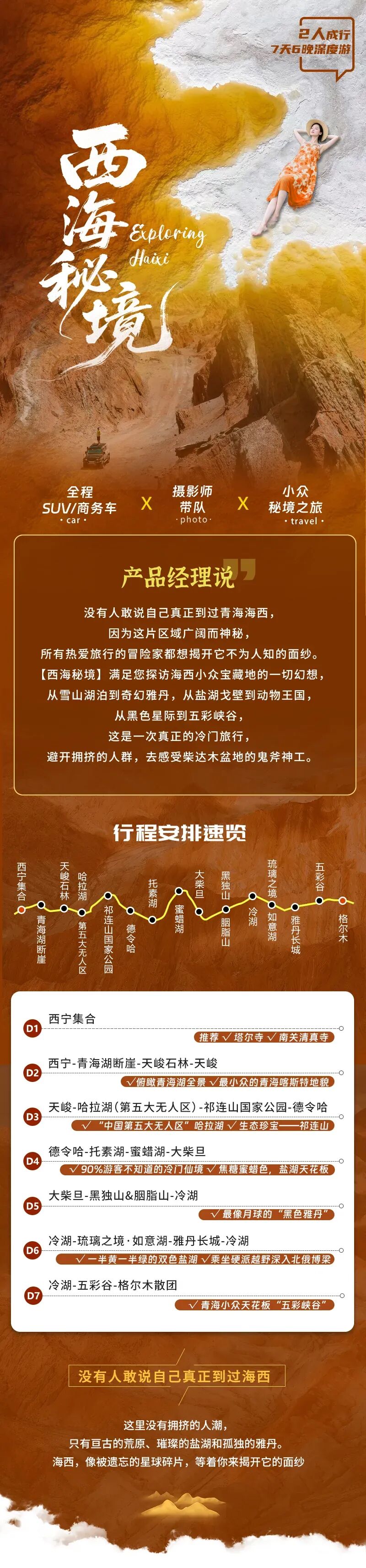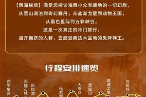 温馨提示: 1、大柴旦镇海拔约3200m;2、行程处于柴达木无人区,建议提前准备零食和水果;