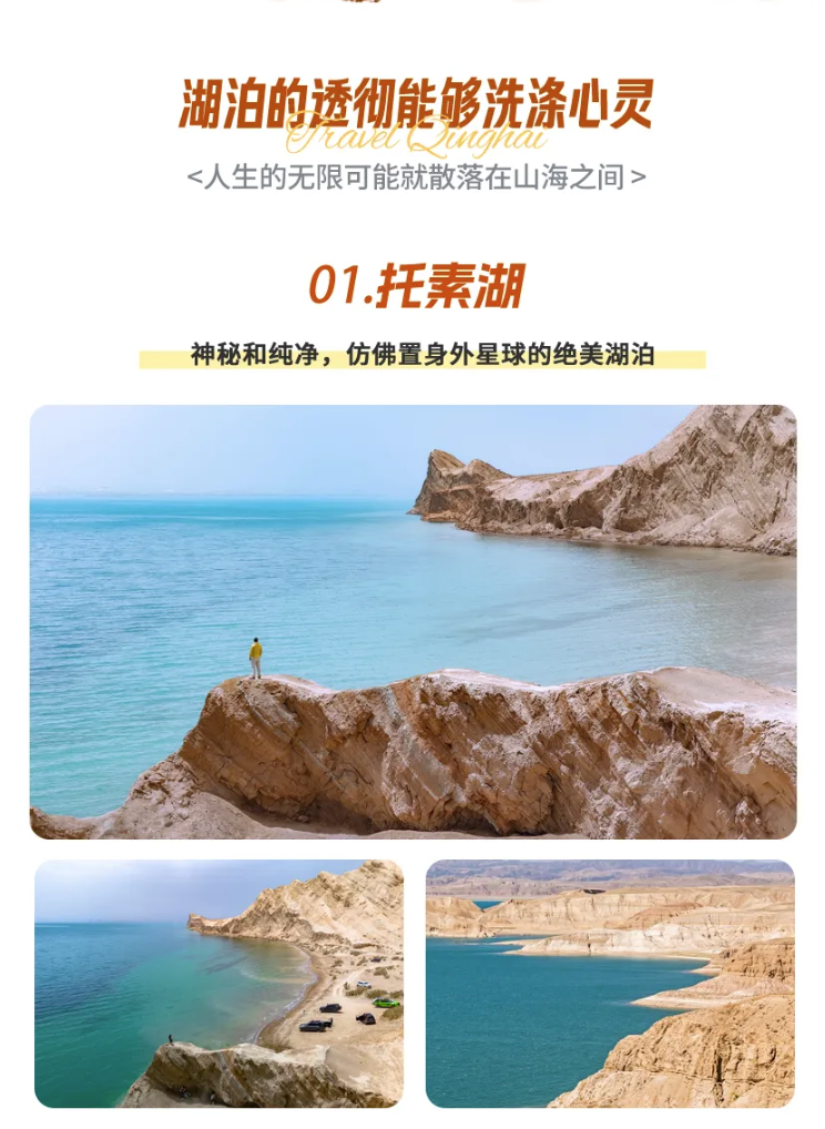 【托素湖】,一个隐藏在青甘大环线上的小众秘境,只有忍受一段烂到不行的路况才有资格欣赏它的美,这也是我们全程suv的原因之一。客观条件限制了人流量,所以托素湖未被打扰的自然风光无比珍贵。透蓝的湖水、成群的飞鸟和茫茫戈壁对比鲜明,一望无际的辽阔让人心情无比舒畅。
