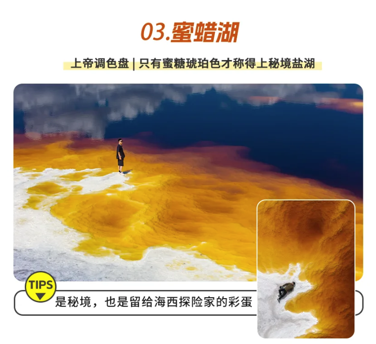 适时离开,前往大柴旦,作为大柴旦翡翠湖的腹地,也是未经完全开发的新景观,【蜜蜡湖】会带给你截然不同的全新感受。湖如其名,它如焦糖般的颜色无比梦幻,没有风的时候,湖水凝固如同琥珀,微风吹起,湖水泛起涟漪,独特的蜜蜡黄层层铺展开来,美的令人叹为观止。