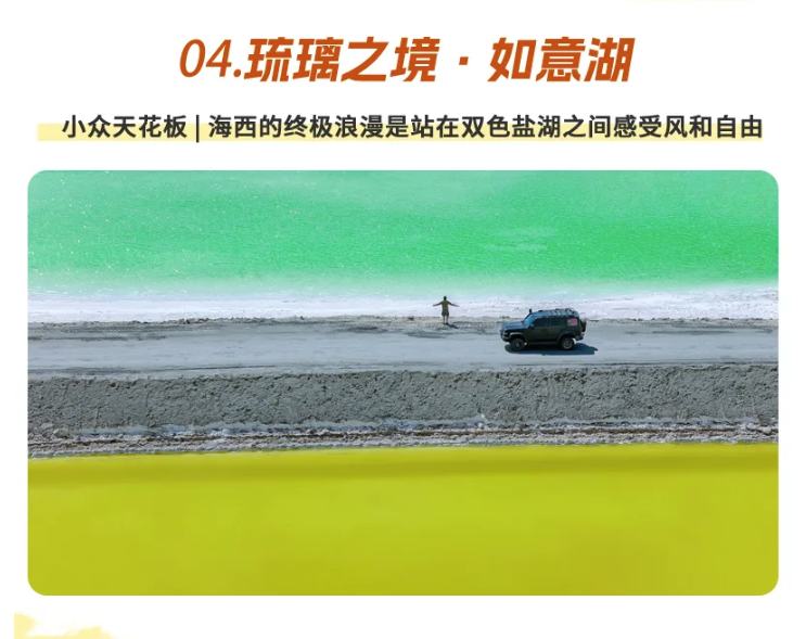 早饭后,我们驱车前往今天的目的地,一个真正的小众景点【琉璃之境.如意湖】,99%的人都没有来过的地方。这里盐湖色彩非常丰富,碧绿色的湖水在风中波光粼粼,而另一边金黄色的湖水深邃的就像一块琥珀,在阳光照耀下闪烁着琉璃般的色泽。穿梭于盐湖之间的小路,沿途湖光山色美不胜收,简直是摄影爱好者的天堂。