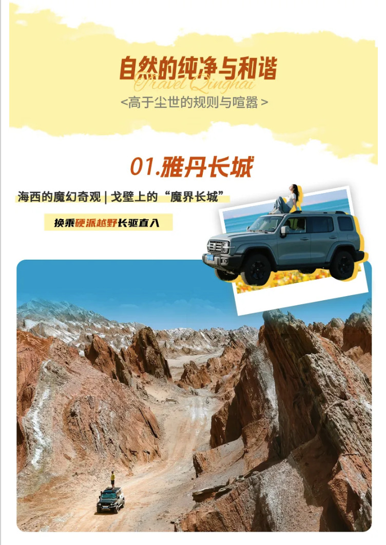 稍后,我们将换车前往【雅丹长城】。这里位于柴达木的荒原深处,放眼望去,满目赤色的雅丹如同龙的身躯一般横亘在戈壁之间,广袤而深邃。穿行其间,眼前是亿万年的风沙雕琢出的壮美,岩壁上的每一道纹理都诉说着时间留下的痕迹。这里充斥着风与自由,还有极致的荒芜和浪漫,这是属于勇敢者的冒险之路。