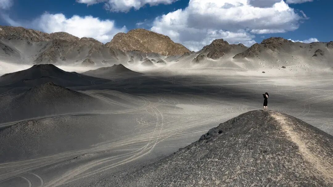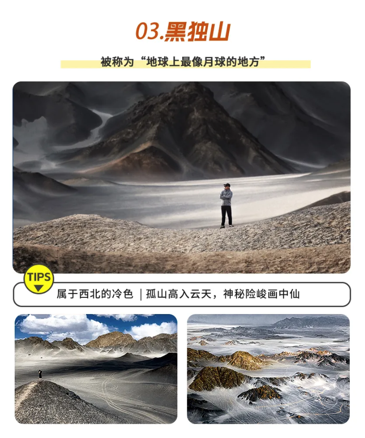 今天第一个目的地,是地处西北戈壁腹地的【黑独山】,作为地球上最像月球表面的小众景点,这里纯粹的黑与白,有种遗世独立的诗意。呜咽的风中偶尔夹杂戈壁的碎石,眼前的山体冷峻而神秘,就像一幅留白十足的水墨丹青。在这里可以轻松拍出朦胧感和致郁系大片,高级感拉满!