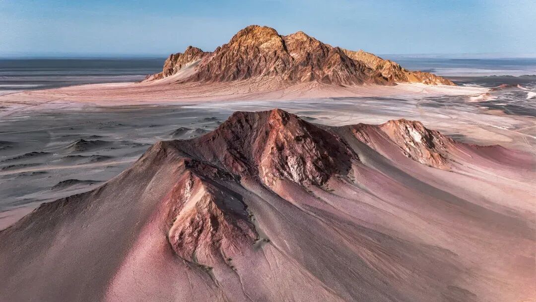 如果说黑独山像一位孤寂的诗人,那【胭脂山】就是一位热情的画家。遍布丹霞地貌的山峰通体弥漫着令人着迷的粉红色,细腻的沙石在阳光照射下像一道五彩斑斓的彩虹,山脉蜿蜒,层次分明,和蓝天白云相衬,好一副粉黛嫣然。