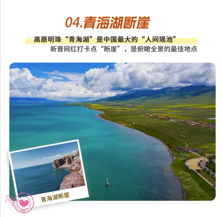 如果你也觉得旅行应是对未知的探索,对心灵的洗礼,而不是在扎堆的旅行团和小贩的叫卖声中草草拍几张打卡照,那么【青海湖断崖】会给本次旅程开一个好头。作为新开发的景点,这里只有惊涛拍岸和飞鸟蹁跹,观景台可以把青海湖的辽阔尽收眼底,走在临海栈道上,潮湿而清冽的风迎面扑来,湖水在脚下翻涌而过,十分舒适。在这里拍照不需要挑角度,随手就是大片。