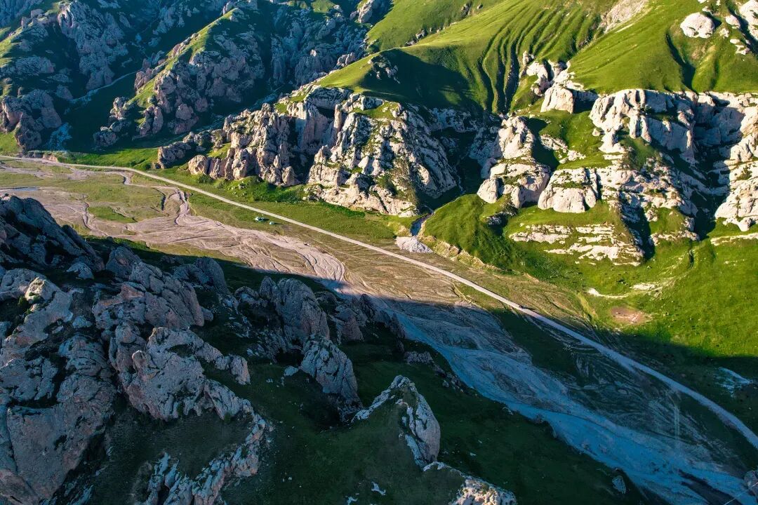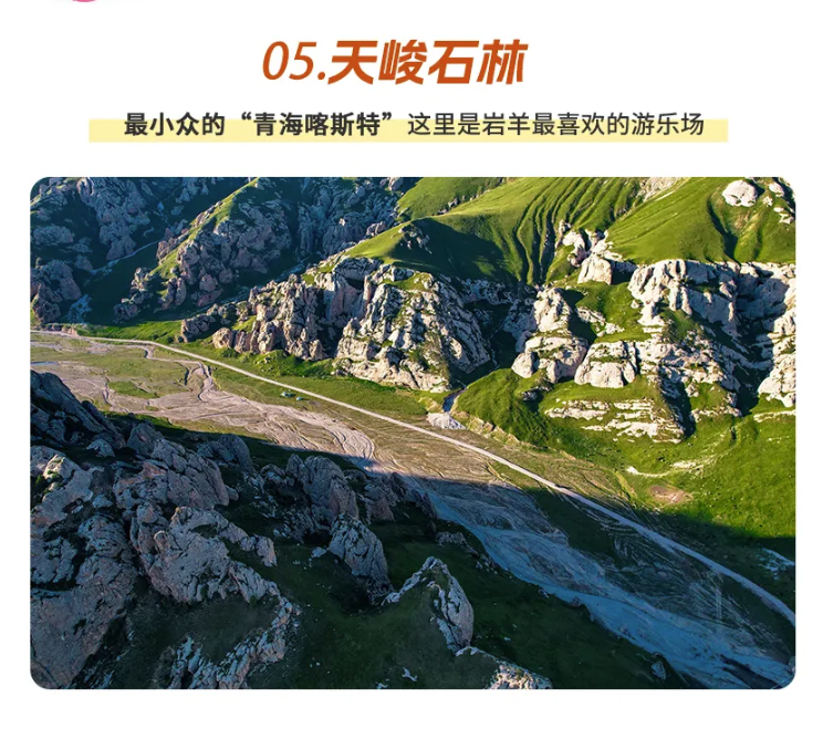 适时离开,前往下一个目的地【天峻石林】。千百年来的干旱和风蚀带来了神秘的自然奇观,这里其峻如刃,却能和温柔的草原妥帖相处。这里同时拥有喀斯特地貌、高山草甸和冰川湖水,造型奇特的巨石数以百计,挂满经幡的山头蔚为壮观,运气好的话,还能看到满地乱窜的小动物。在这里,你会感受到灵魂在畅快的呼吸,就像远处的云雾永远如风自由。
