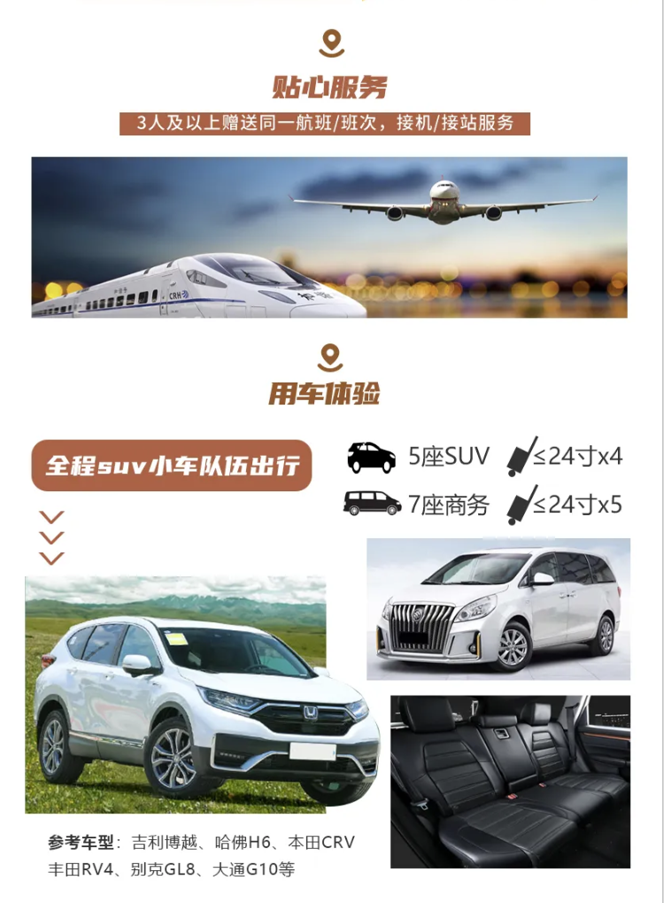 【交通】全程5座SUV或7座商务车包车费用;含司机吃住、油费、过路费; (5座SUV坐4人+1司机,7座商务坐5人+1司机),商务车不支持指定,根据最终人数安排;