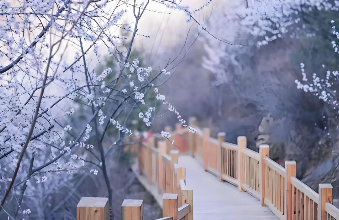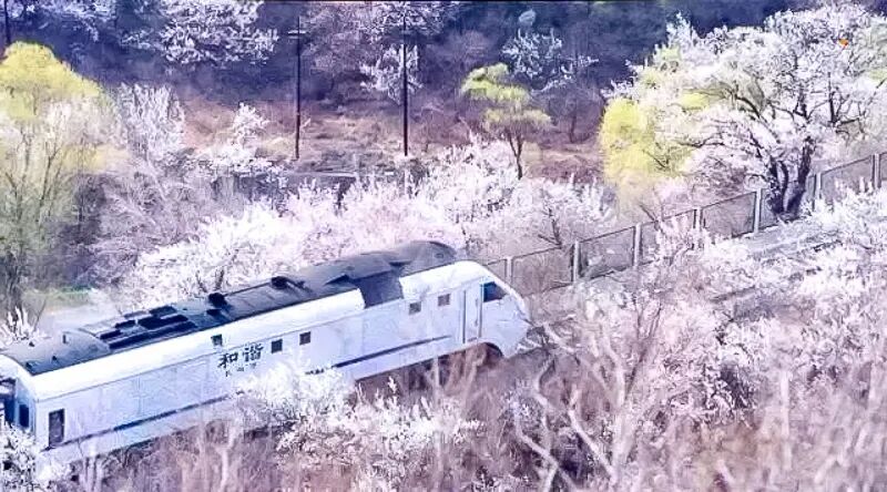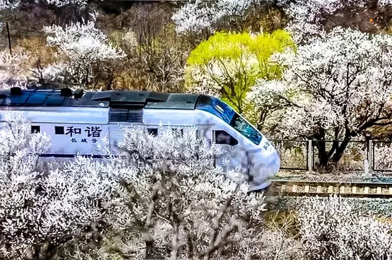 一辆辆白色的列车在花海中穿行它不仅仅是开往春天更是开往希望开往美好的未来- 居庸关长城 - 春当时,桃花、杏花、樱花逐渐进入怒放期……