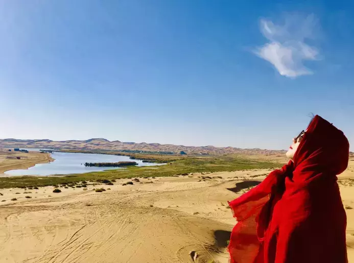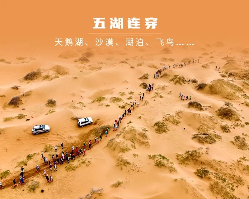 徒步过程中会经过大小不等5个湖泊,有淡水湖也有咸水湖,恍如世外桃源。每年3月和11月的水鸟迁徙季节会有大量珍惜水鸟停留腾格里沙漠;每年5-6月沙枣花开,离很远就能被沙枣花的香味唤醒;每年5-6月,湖边大片马兰花盛开呈现给你一个沙漠的春天。