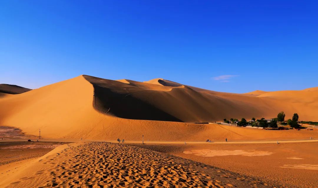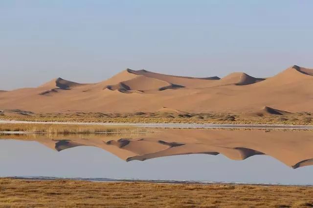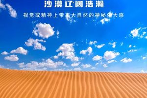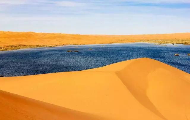 越往沙漠深处走,看到的越来越美丽,那些没有被越野车车轮压过的沙丘就像一幅完整的布疋,让人忍不住的想要去抚摸它却又怕会破坏了它的夸姣。金黄色的沙丘衬托着蔚蓝色的天空,不用润饰,这自身就现已是一副极致的著作。