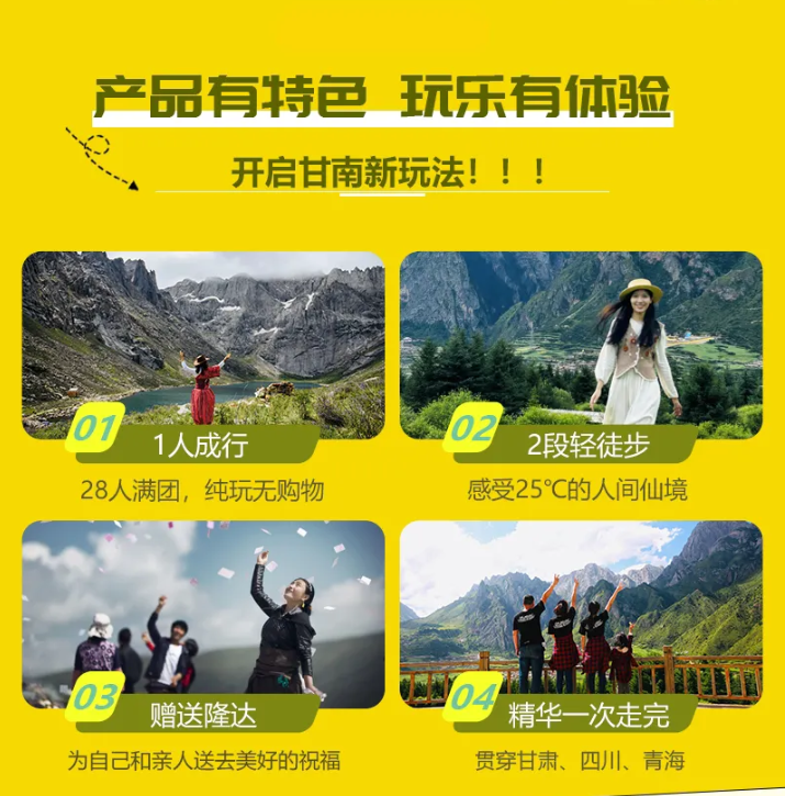 1、藏族祈福传统:五彩经幡,撒隆达。2、九曲黄河第一湾上行扶梯。3、旅行四宝(眼罩、颈枕、魔术头巾、耳塞)。4、每人每天一瓶矿泉水。