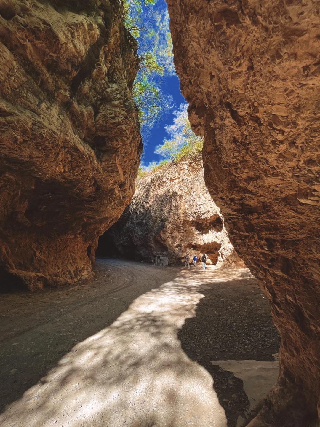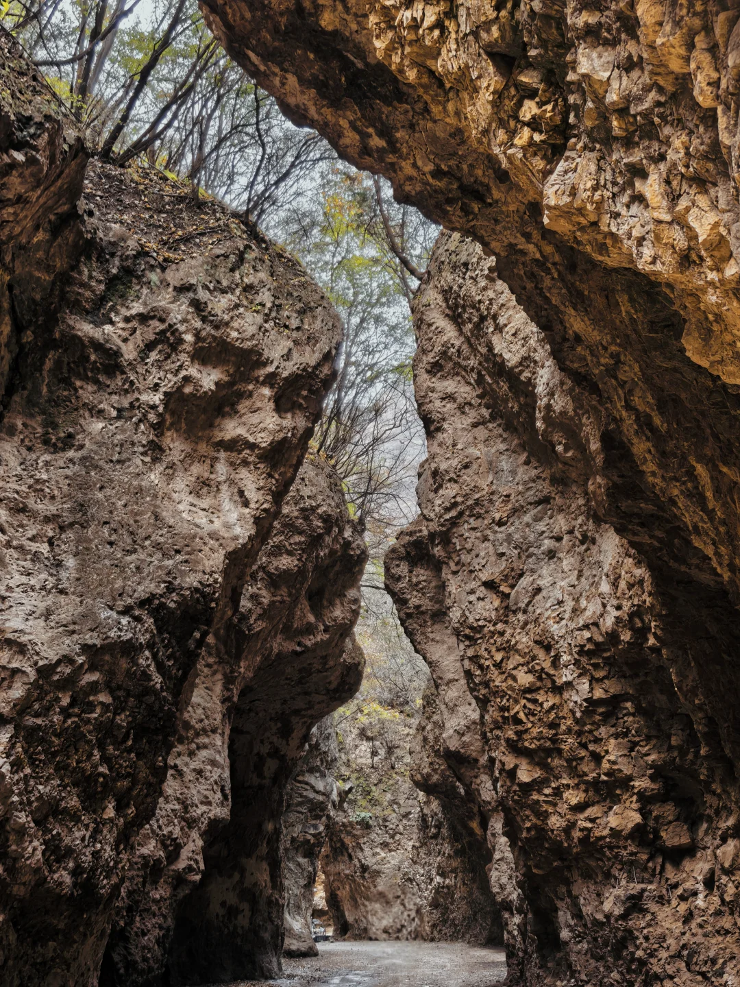 一线天,很神奇,两边连接着公路,一边是柏峪村,一边是爨底下村。据说这条裂缝是人们挖掘拓宽行成的,百米沟底没有铺装,车经过会带起灰尘,增加了神秘感。