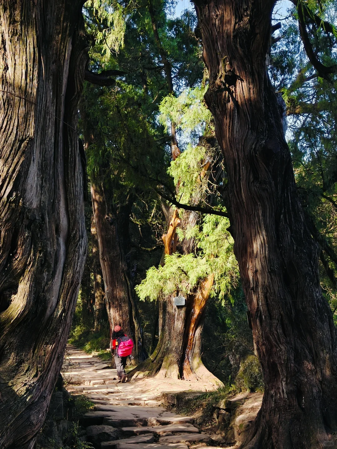 沿途可以观赏到:1. 古柏王国:挂牌古柏4133株,平均树龄超千年,有张飞柏、天蓬柏等奇树;是翠云廊古柏最密集的区段;浓荫蔽日,春秋光影绝佳,2. 古迹沧桑:金牛道(剑阆官道)遗存;沿线有古楼铺、云城寺遗址、断碑梁残碑;游客极少,几乎无商业化,氛围纯粹3. 视野亮点:山脊线天气好时可观云海;林间安静,只有风声鸟鸣。