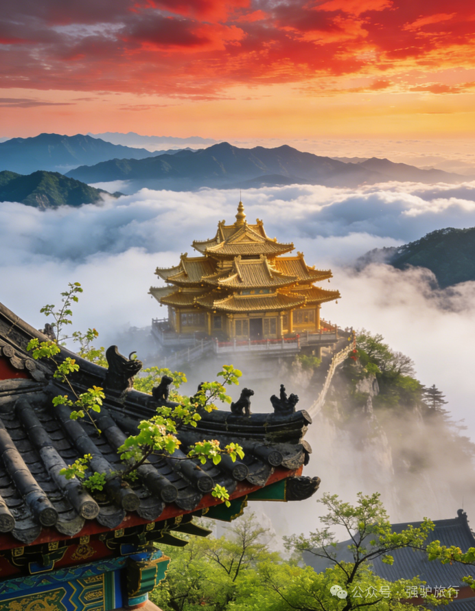 《武当山》道教圣地,位于湖北十堰。群峰巍峨,紫霄宫、金顶等古建群被列入世界文化遗产。武当武术名扬天下,素有“亘古无双胜境,天下第一仙山”之美誉。