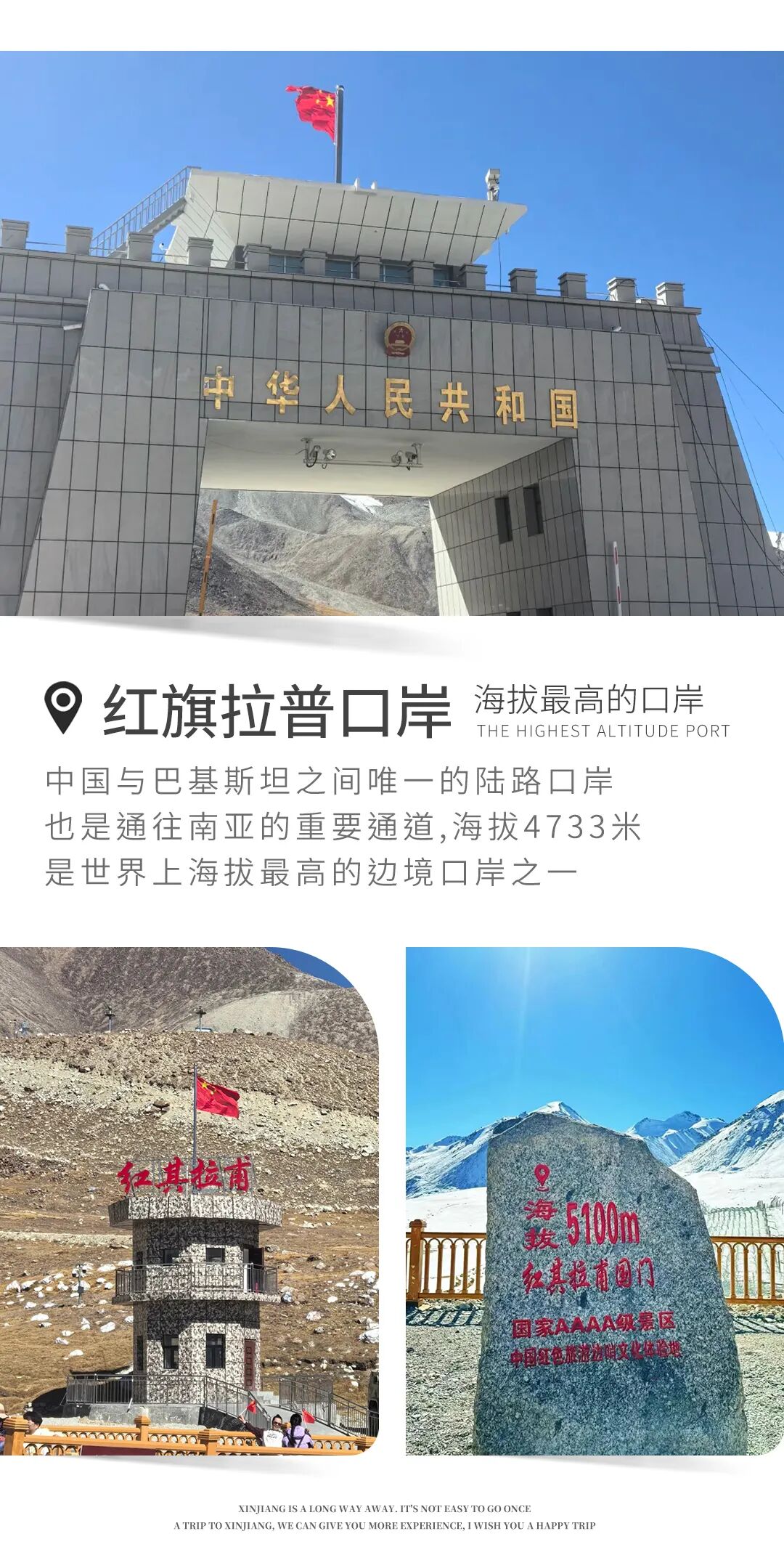 一路前行抵达【红其拉甫】。红其拉甫国门是祖国的西大门,阳光下的国门雄伟壮观,是屹立在帕米尔高原的世界最高国门。这里位于中国与巴基斯坦的交界处,是中国通往巴基斯坦唯一的陆路进出境通道。中巴7号界碑是中巴公路314国道中方境内的终点。它不仅是国界的象征,也是中巴友谊的见证,更承载着无数戍边人对国家的忠诚奉献。