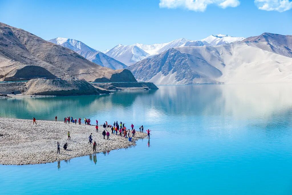 随后停靠白沙湖北岸,与南岸的白沙湖不同,北岸的白沙湖少了游人的拥挤,更能独享这片美景,白沙湖中拥有碧蓝的湖水,远处是散落一地洁白色的沙子,而在湖泊的四周远处则是皑皑雪山。整个白沙湖都被四周的雪山团团包围住,四周高大的雪山犹如像一位慈祥的“母亲”一样守护着这片高原湖泊,让它不被外界打扰。