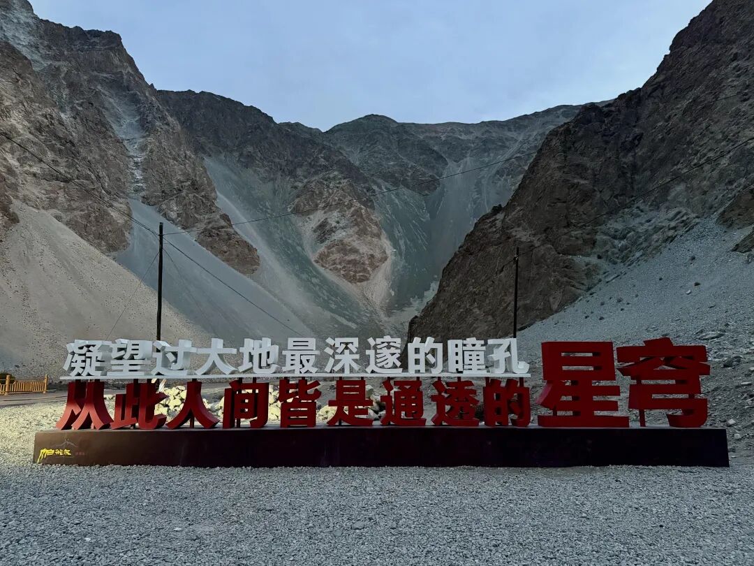 接着前往打卡帕米尔之眼,这里是塔莎古道上的一处自然奇观。它由彩色砂石倾泻形成的山体构成,远看像一只巨大的眼睛,充满压迫感和神秘色彩。