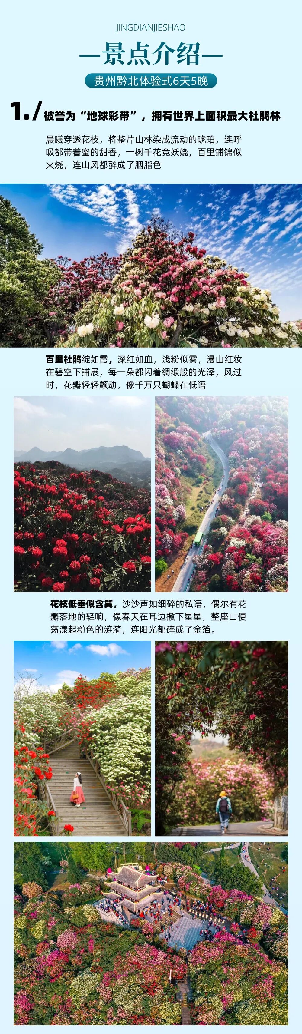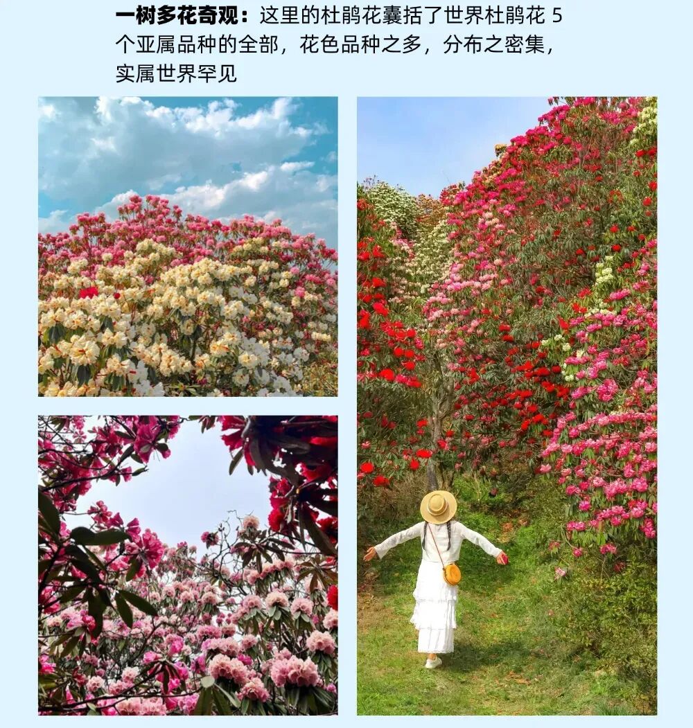 上午:早餐后乘车前往国家5A级风景名胜区【百里杜鹃】,车程约2.5H,百里杜鹃实为一座规模宏伟的天然花园,在长约50公里的狭长丘陵分布着几十个品种杜鹃,拥有125平方公里的野生杜鹃林,百里杜鹃因此得名。迄今为止是世界面积最大的野生杜鹃花国家森林公园,最难得的一树不同花,可在一棵树上开出不同颜色的花朵,达7种之多。树龄千年的杜鹃花王,花开季节繁花万朵。