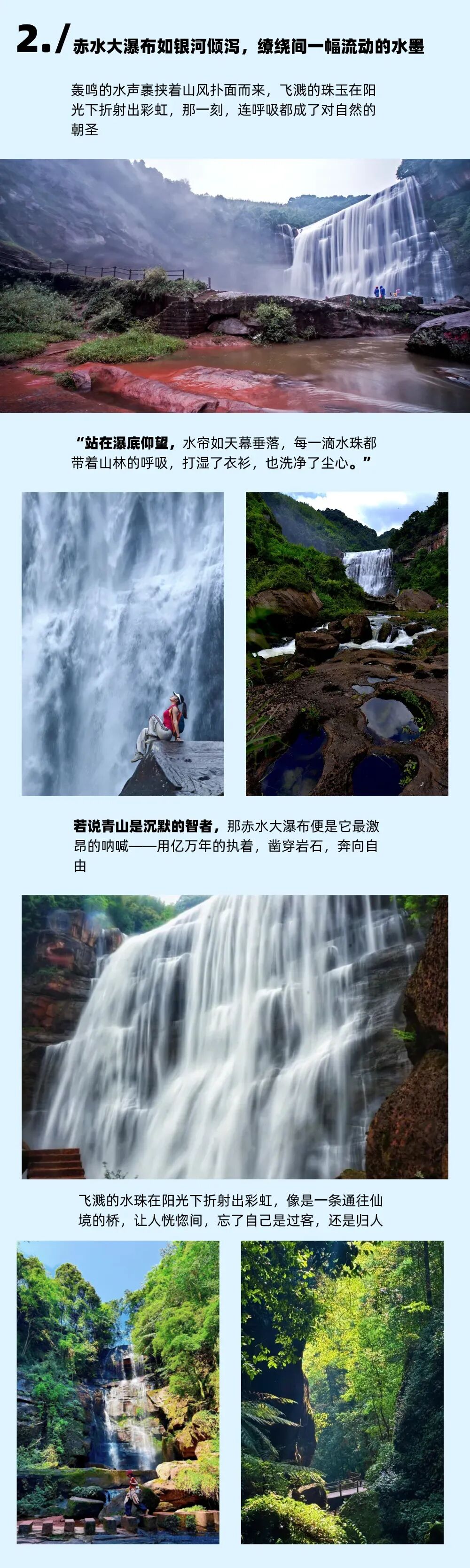 下午:驱车到达【赤水大瀑布】徒步核心环线,打卡“十丈洞大瀑布”(贵州第二大瀑布),走进水帘洞感受磅礴气势,沿途赏丹霞岩壁与原生竹林,在贵州北部的丹霞秘境中,藏着一处能“洗去尘嚣”的胜地——赤水大瀑布。它不像名山大川那般张扬,却以百米落差的磅礴、水雾氤氲的空灵,成为赤水河畔最动人的音符。当你循着湿润的风走进这片竹林深处,一场与水、与山、与丹霞的邂逅,便已拉开序幕