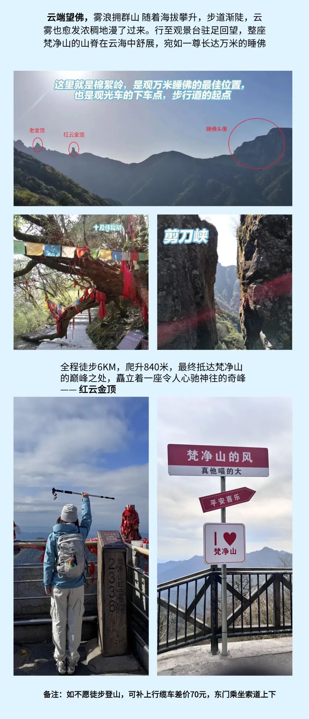 备注:这是一条能完整的游玩整个梵净山景点的线路,全程徒步6KM,爬升840米,如不愿徒步登山,可补上行缆车差价70元,东门乘坐索道上下