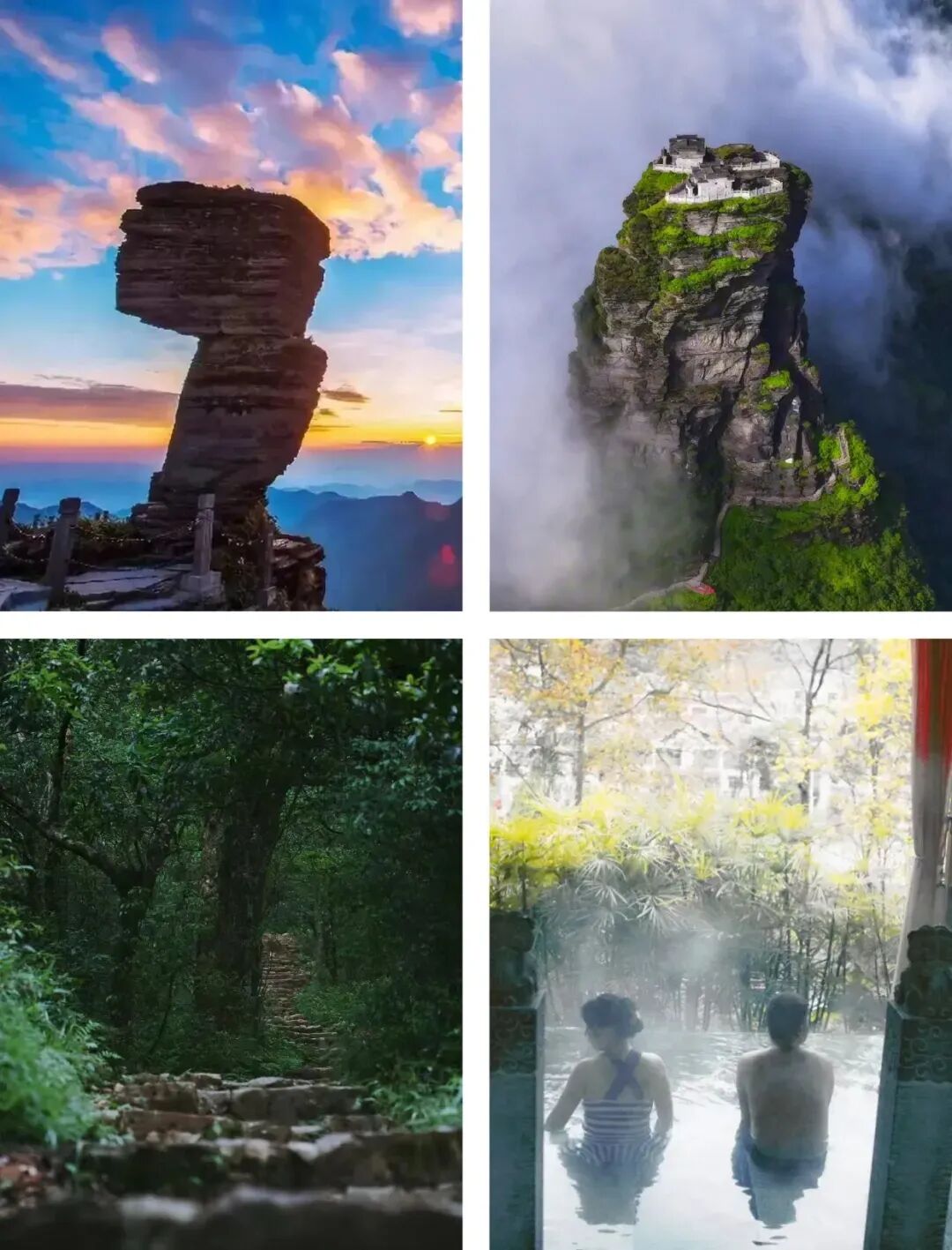 上午:8:00早餐后我们出发前往【梵净山西门】从梵净山西门出发,这里早在明万历年间,这里已是信徒朝山的西线要道,以护国寺为起点的步道雏形便已形成,是梵净山朝山古道之一,石阶在密林间延伸,负氧离子裹着草木清香沁入心脾。沿途古木参天,珙桐枝叶轻摇,偶有灵猴攀枝而过。越往上,山路越陡,手脚并用攀上“剪刀峡”,抬头便见红云金顶如石柱擎天,云雾在其周身流转。登顶瞬间,脚下奇石嶙峋,远处山峦叠翠,“一览众山小”的壮阔涤荡心怀。随后从东门乘缆车下行,缆车穿梭于云端,脚下峰峦如水墨铺展,金顶渐成远景,山风拂过,将徒步的酣畅与登顶的震撼,都融进这一路云端风光里,直至江口落地仍觉意犹未尽