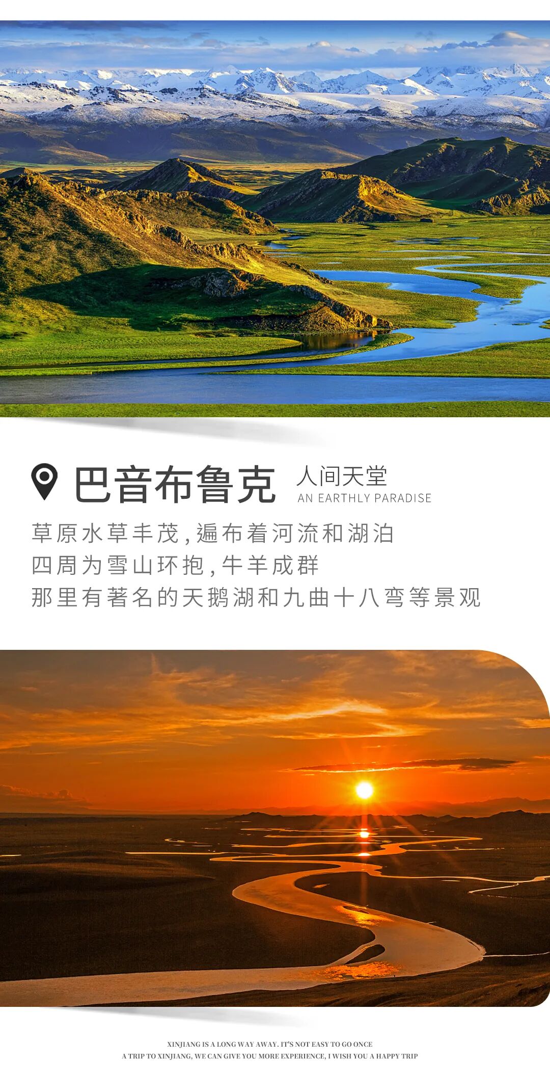 日落时分赶往巴音布鲁克大草原。巴音布鲁克草原景区又名天鹅湖景区,在 蒙古语中意为丰泉——“丰富的泉水”。这里的草原水草丰茂,遍布着河流和湖泊,而草原周围则由山峦环抱,连绵的丘陵和辽阔的草甸相间,景色十分漂亮。巴音布鲁克草原内有著名的巴音布鲁克天鹅湖和九曲十八弯等景观。