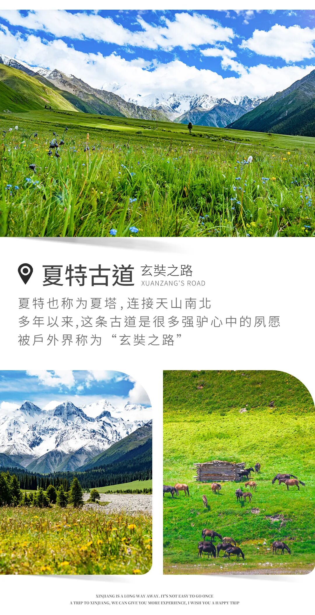 之后我们前往夏特古道。夏特也称为夏塔,连接天山南北,在户外圈中名气很大,被户外界称为“玄奘之路”,多年以来,穿越夏特古道是很多强驴心中的夙愿。今天我们安排大家行走的是景区内最精华的一段休闲线路,一路上绿草茵茵,鲜花满布,中间的夏特河水时缓时急,奔流向前。每年5月底阳光下的昭苏大草原风吹麦浪直抵雪山脚下,熠熠生辉;而6、7月漫无边际的油菜花犹如一条条黄色的织毯席卷着广阔无限的昭苏大草原,就像那一望无际的金色海洋,与天山遥相辉映,堪称西部盛景。